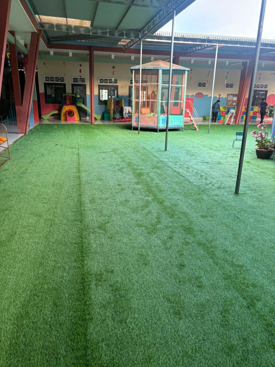 anh em trải hoàn chỉnh xong, sắp xếp lại các chậu hoa ngay ngắn với nhau.