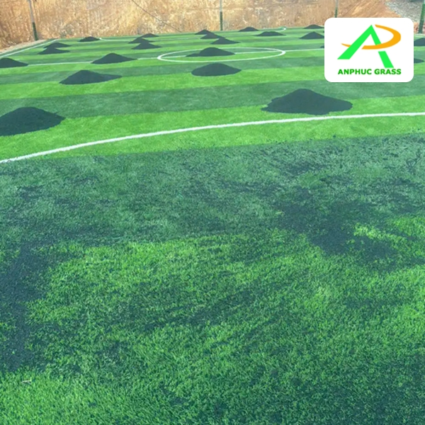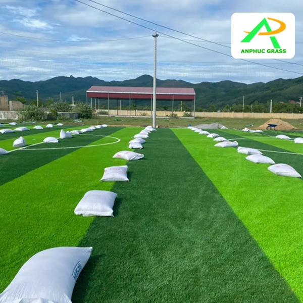 Khi nền sân đã chuẩn bị xong, An Phúc trải lớp cỏ nhân tạo đạt tiêu chuẩn quốc tế. Cỏ được trải đều, dán keo liên kết và cắt line trắng theo đúng kích thước.